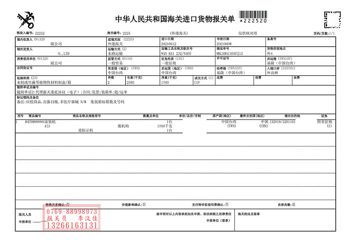 發(fā)貨人真實(shí)填寫:涂裝機(jī)報(bào)關(guān)申報(bào)要素: