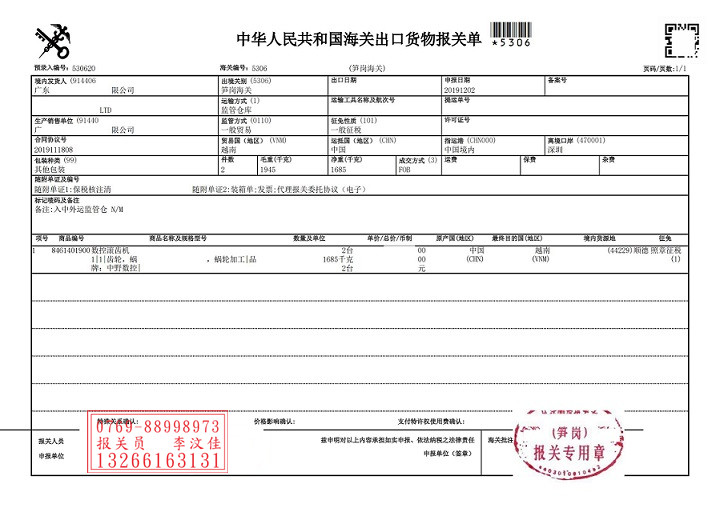 越南由于其特殊的地理位置優(yōu)勢,貨物出口到越南的運(yùn)輸方式比較多樣,可以選擇海運(yùn),空運(yùn),鐵路運(yùn)輸,甚至可以發(fā)中越陸運(yùn).對于每一種運(yùn)輸方式來講都有其優(yōu)勢,而出口廠商在選擇物流時,可以跟據(jù)貨物概況,越南收貨的要求,以及自身的資質(zhì)要求選擇便捷合規(guī)的貨運(yùn)操作.下面聚海小編為大家主要講述一般貿(mào)易報關(guān)出口越南胡志明海運(yùn),而且是散貨拼箱模式,客戶有進(jìn)出口權(quán),需要一般貿(mào)易正式報關(guān)出口,并且要完成外匯核銷和出口退稅.此次案例的產(chǎn)品為:數(shù)控滾齒機(jī),報關(guān)口岸為:筍崗海關(guān).詳細(xì)操作流程和報關(guān)手續(xù)詳見以下內(nèi)容: