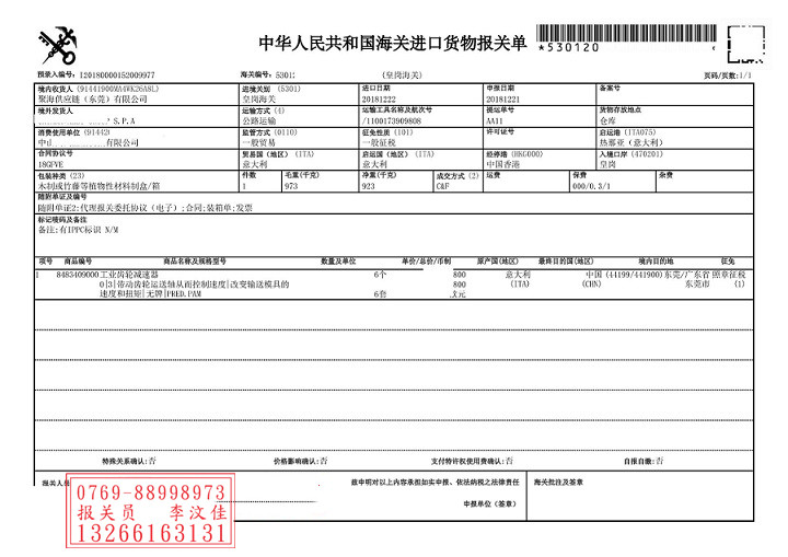 三,意大利工業(yè)齒輪減速器黃埔港清關(guān)資料: