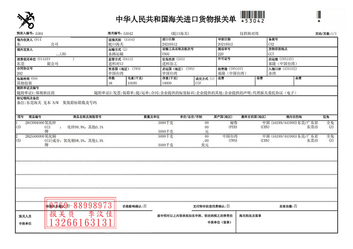 進(jìn)口臺灣氧化銅蛇口港報(bào)關(guān)案例
