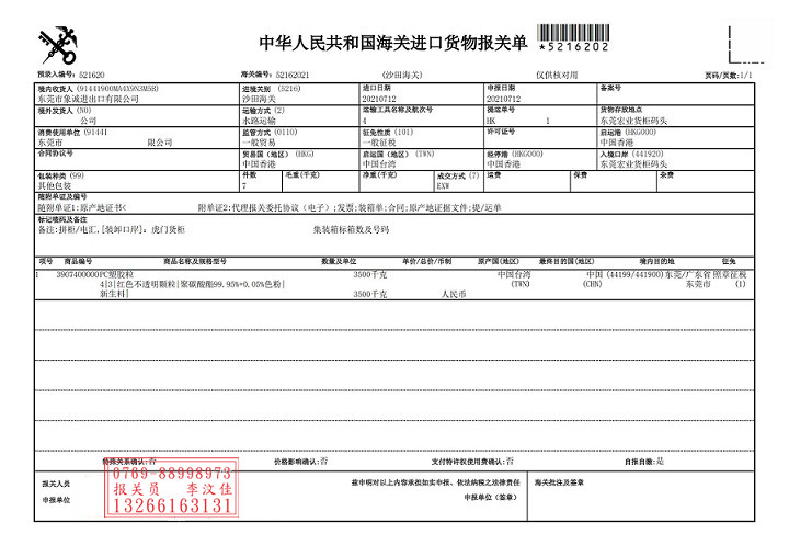 下面聚海小編就為大家梳理一下臺(tái)灣聚碳酸酯PC塑膠粒進(jìn)口所需要辦理的報(bào)關(guān)手續(xù),海關(guān)進(jìn)口稅率以及進(jìn)口操作流程.備注:由于收貨單位在東莞大朗,所以選擇的清關(guān)口岸為東莞虎門(mén)港.