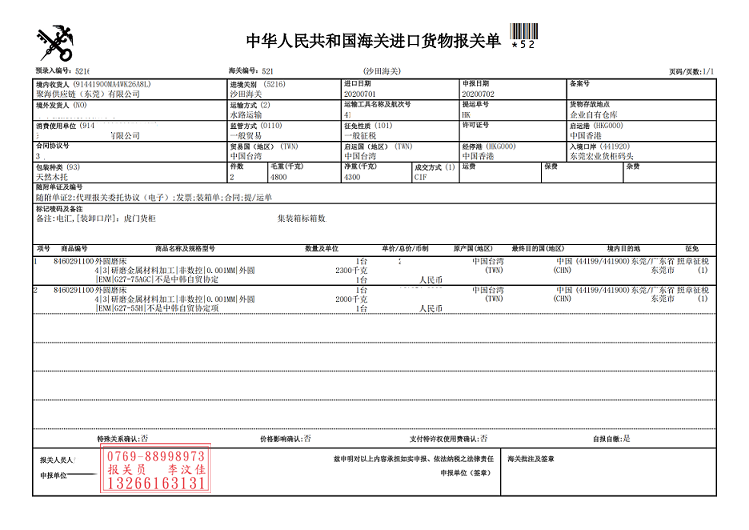 慶幸公司同事機緣巧合剛剛兩臺臺灣產外圓磨床,因為收貨單位為東莞清溪一臺資企業(yè),所以清關口岸選擇的是東莞虎門宏業(yè)碼頭,該企業(yè)剛剛注冊成立,人手也不夠,且對虎門港進口清關手續(xù)也不是特別了解,一來二去多次溝通后,最終確認臺灣工廠交貨即EX-WORK的成交方式,由小編公司全程操作整套物流及清關.這不剛剛拿到進口報關單,小編就迫不及待的把整個操作流程整理出來,希望能帶給更多小伙伴技術指導.